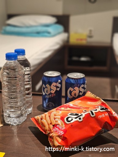 우리는 룸에서 가져온 간단한 안주와 술로 조용히 하루를 마무리했어요.
