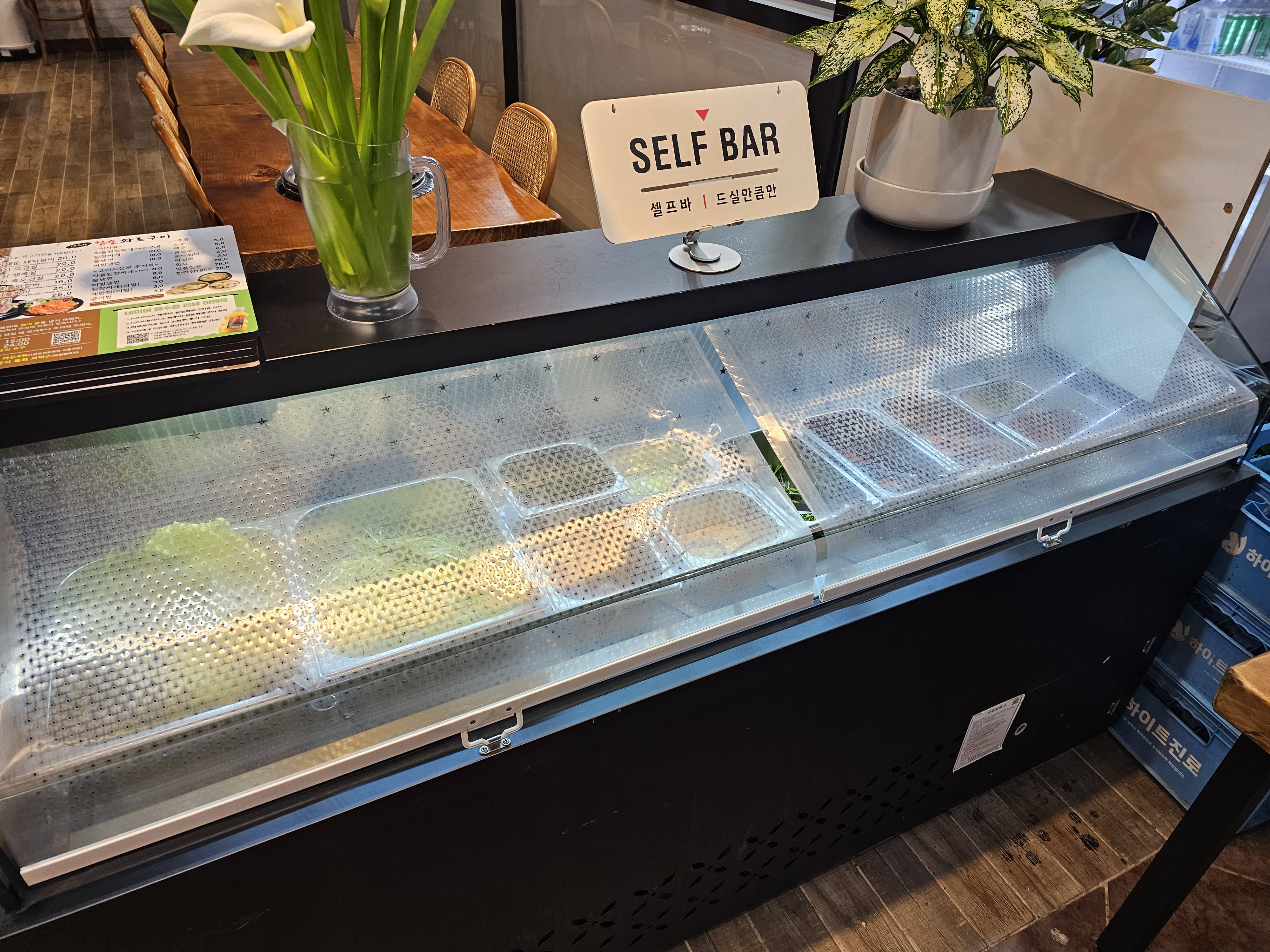 각종 반찬과 쌈 채소는 셀프바에서 직접 가져다 먹는 구조인데, 모든 음식이 냉장보관되고 있었고, 위에 비닐 커버가 덮여 있어 청결함이 돋보였어요.