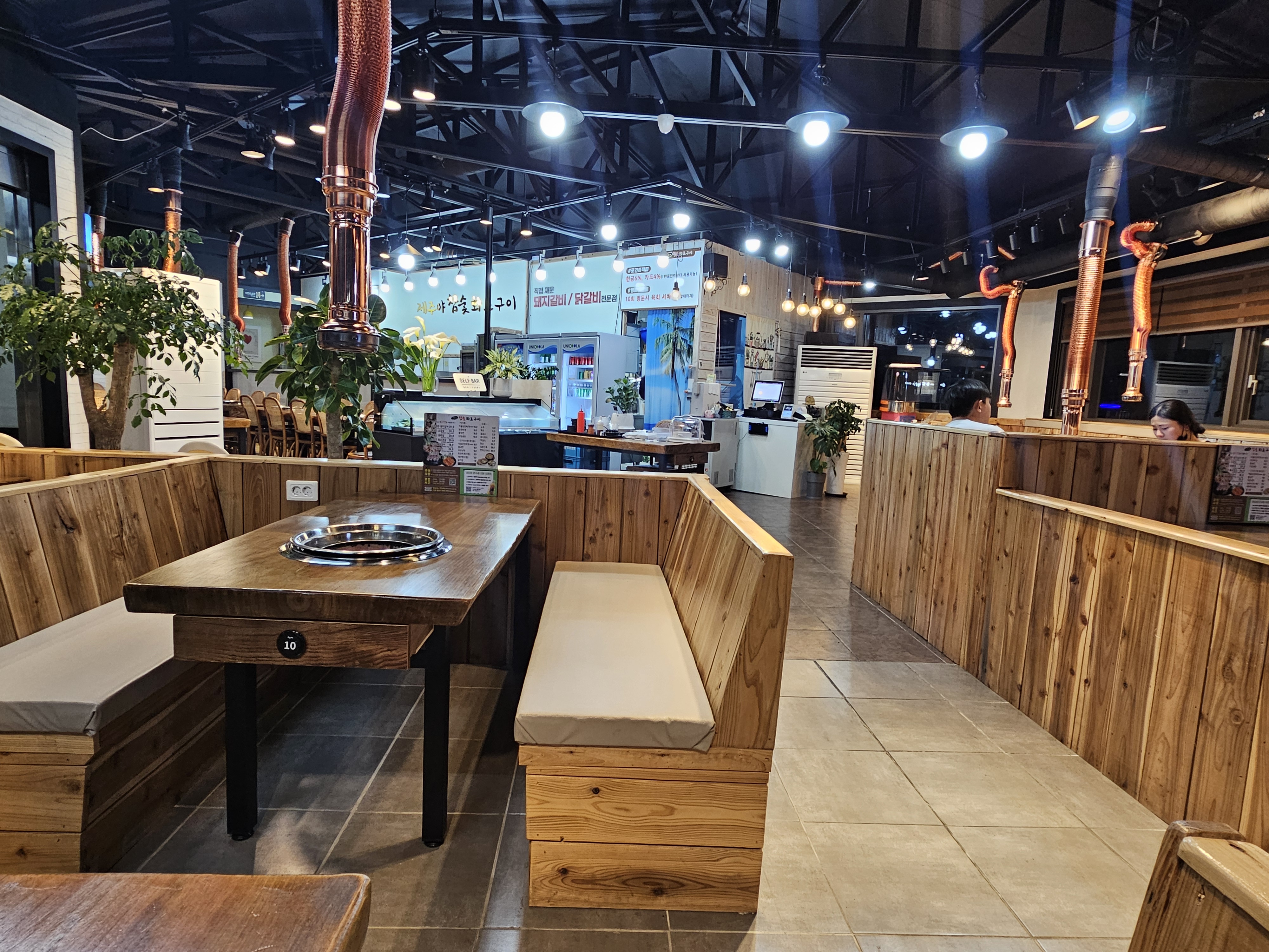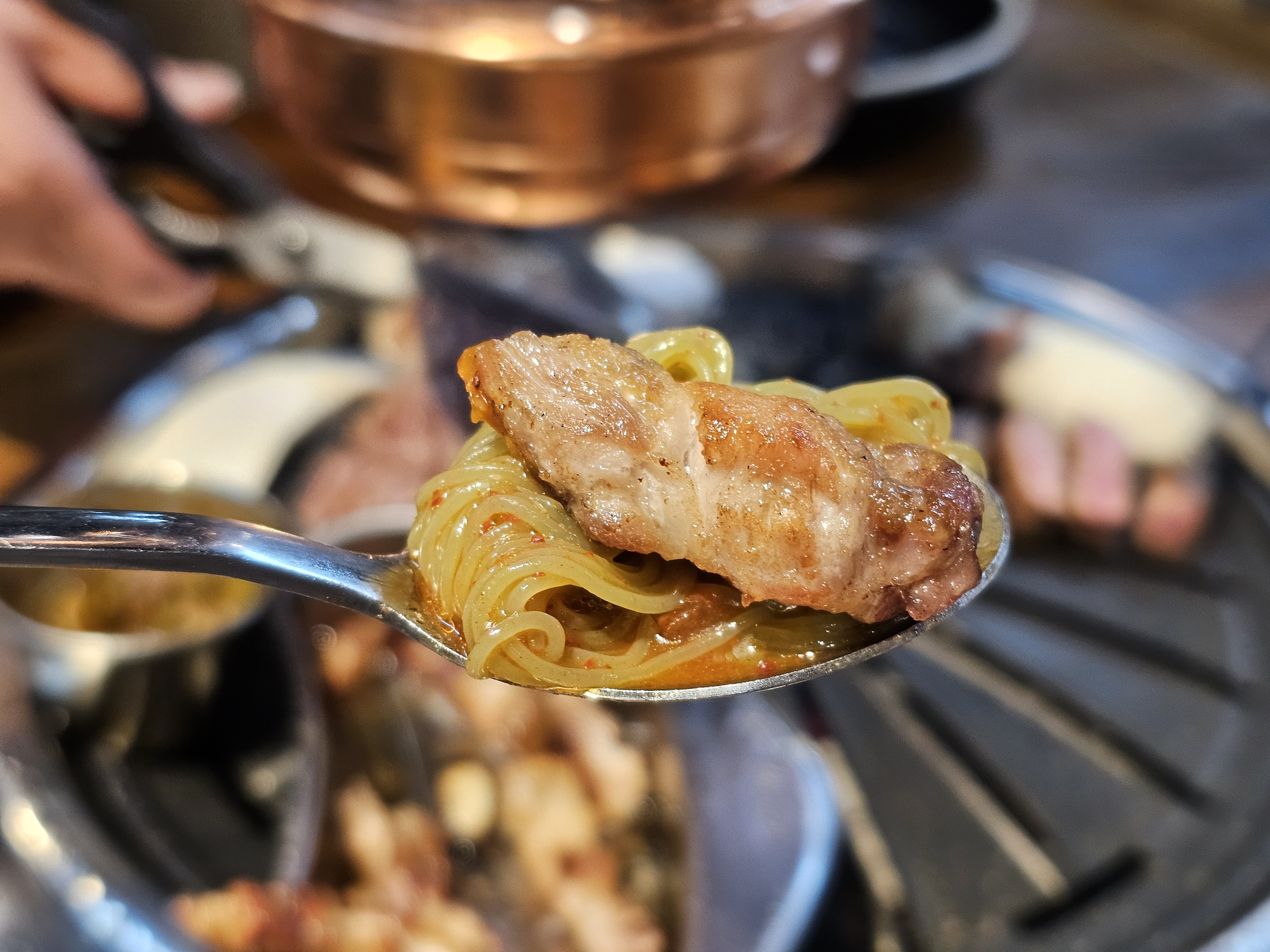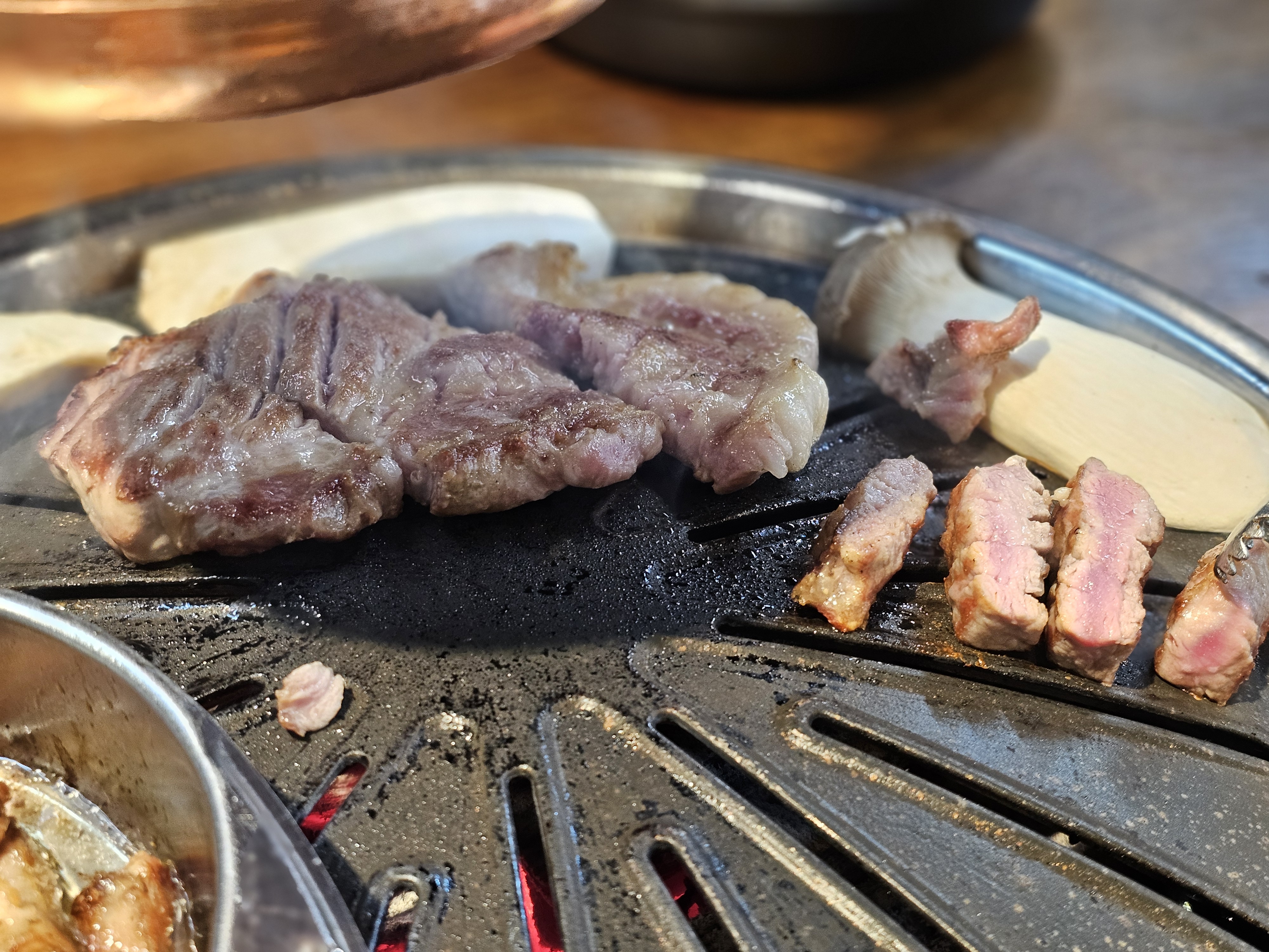 고기는 참숯 화로에서 구워 먹는 방식이라 불향이 살아 있었고, 기름기 적당히 도는 오겹살의 쫀득쫀득한 식감과 두툼한 목살의 고소함이 일품이었어요.